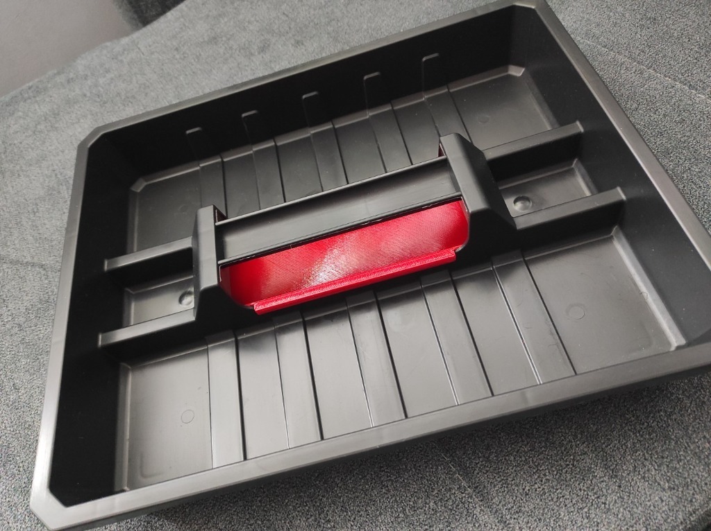 Zaślepka to wydruk 3D, ma powodować by z tacki nie wypadało nic przez otwór na dno skrzynki
